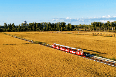 在黑龙江省佳木斯市同江市,旅游小火车在稻田间行驶(无人机照片)。新华社发(刘万平摄)