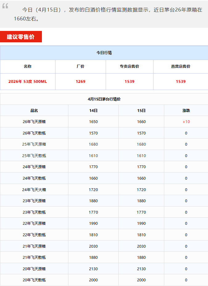 “红色壹号”披露的最新批发参考价显示,4月15日,26年飞天茅台原箱报1660元/瓶,较上一日上涨5元;26年飞天茅台散瓶报1570元/瓶,与上日价格持平。25年;飞天茅台原箱报1680元/瓶,较上一日上涨5元;25年飞天茅台散瓶报1610元/瓶,与上日价格持平。