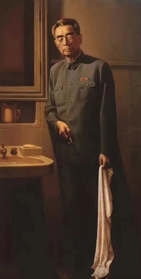 周总理站在洗手台边,一手拿着毛巾,一手拿着剃须刀,靠着墙睡着了。