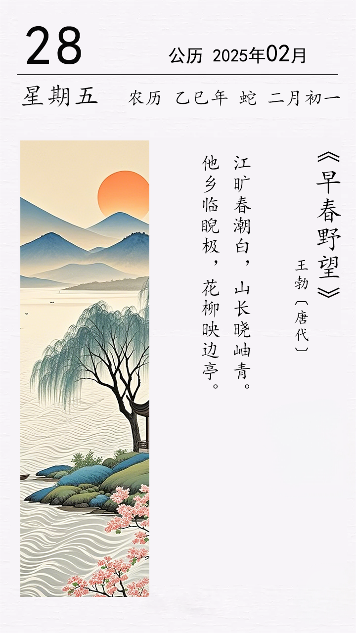 “江旷春潮白”,首句,诗人以开阔的江面为背景,描绘春潮涌动的景象。此时江水上涨,春潮浩渺,呈现出一片洁白之色,象征着早春的纯净与活力。